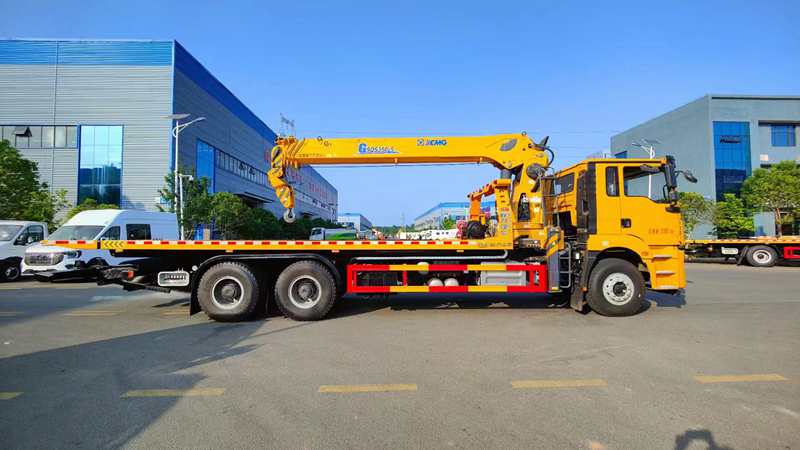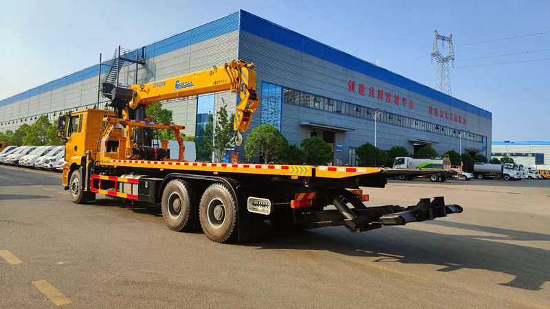 上裝配置:18噸上裝,15噸卷揚,6毫米厚花紋板,進口液壓件,18噸三 節(jié)后托臂, 平板做下沉,板總長8.5米,尾部帶1米液壓翻轉(zhuǎn)尾板,托插座壹對套,拖叉兩對,抱胎裝置一套,綁帶陸條,輔助小車,輔助氣管兩根,警燈,洗手水箱,大梁尾部加固,另配徐工12噸至14噸吊機